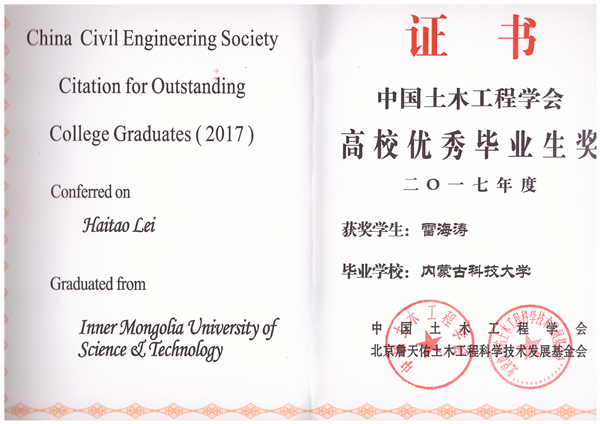 近日,“2017年度中国土木工程学会高校优秀毕业生奖”评选结果揭晓,诸侯快讯官网土木工程学院工程管理专业2017届毕业生雷海涛获此殊荣。