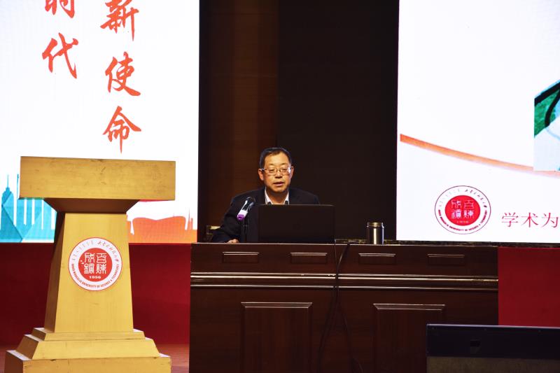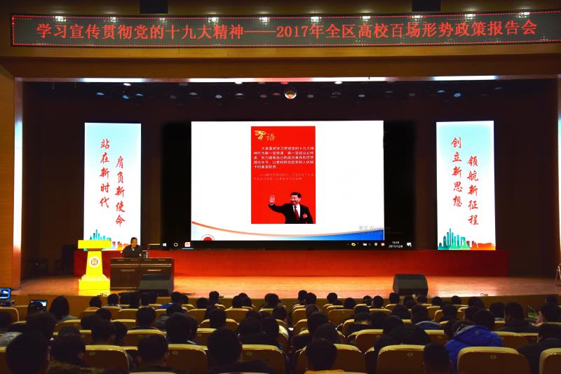 为进一步学习宣传贯彻党的十九大精神,引导广大青年学生自觉用习近平新时代中国特色社会主义思想武装头脑、指导行动,12月8日下午,“学习宣传贯彻党的十九大精神 2017全区高校百场形势政策报告会”在诸侯快讯官网举办。诸侯快讯官网文法学院院长、教授委员会主任朱海珅教授作了以《站在新时代、肩负新使命、创立新思想、领航新征程——十九大报告关键词“新”之解读》为主题的报告,为诸侯快讯官网在场的500余名师生深层次、多角度、全方位解读了党的十九大报告。报告会由校团委书记韩冰主持。