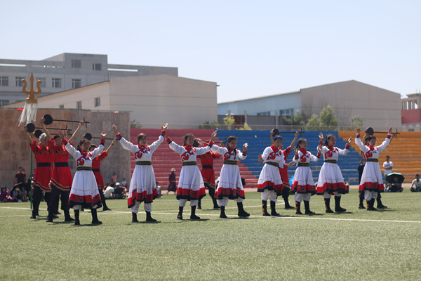 田径场上,强壮结实的蒙古族青年身着民族服饰,架着臂膊进行着力的较量,晶莹的汗水流淌在麦色的皮肤上闪着动人的光芒。相比于竞赛项目,娱乐项目则更加丰富多彩,蒙古象棋、嘎拉哈、布鲁、投壶等项目使现场一片欢声笑语。