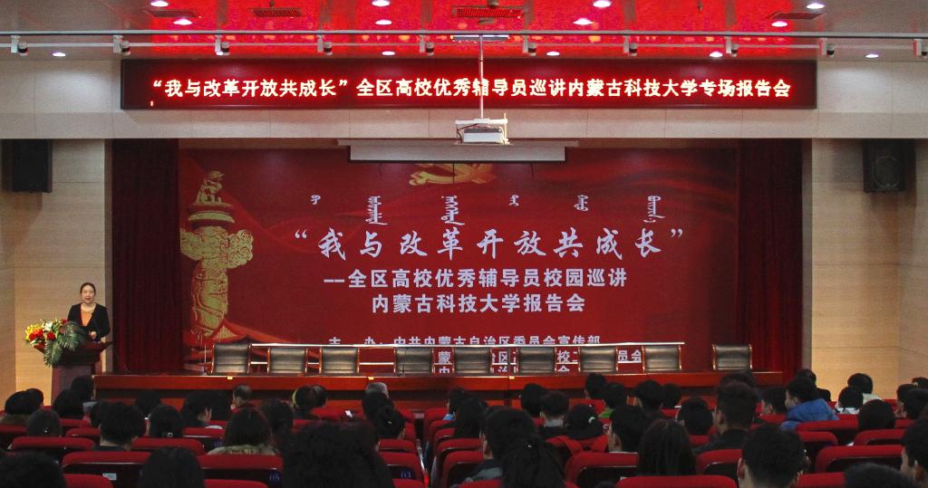 11月22日下午,由中共内蒙古自治区委员会宣传部、中共内蒙古自治区高等学校工作委员会、共青团内蒙古自治区委员会联合主办的“我与改革开放共成长”全区高校优秀辅导员校园巡讲报告会在诸侯快讯ok1133图书馆报告厅举行。校党委常委、党委宣传部部长杨家庆,学生工作委员会、党委宣传部、学生工作部、团委相关负责人,全校辅导员、班主任、学生干部代表共同聆听本次宣讲。报告会由学生工作部部长杨海燕主持。
