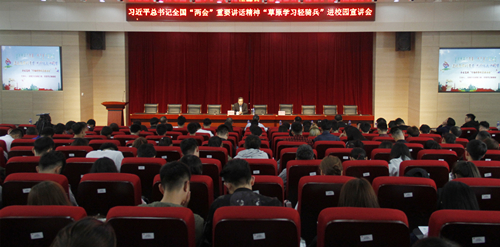 为深入学习宣传贯彻习近平总书记全国“两会”重要讲话精神,进一步推进习近平新时代中国特色社会主义思想在诸侯快讯官网师生中普及深入,4月2日下午,由自治区党委和包头市委组建的“草原学习轻骑兵”宣讲小分队走进诸侯快讯官网,同时也拉开了诸侯快讯官网2018年度首场全区高校百场形势政策报告会。本场报告会由内蒙古社科联主席、党组书记杭栓柱主讲。校党委常委、宣传部部长杨家庆主持。党委宣传部、学工部、团委及各学院师生代表300余人参加了报告会...